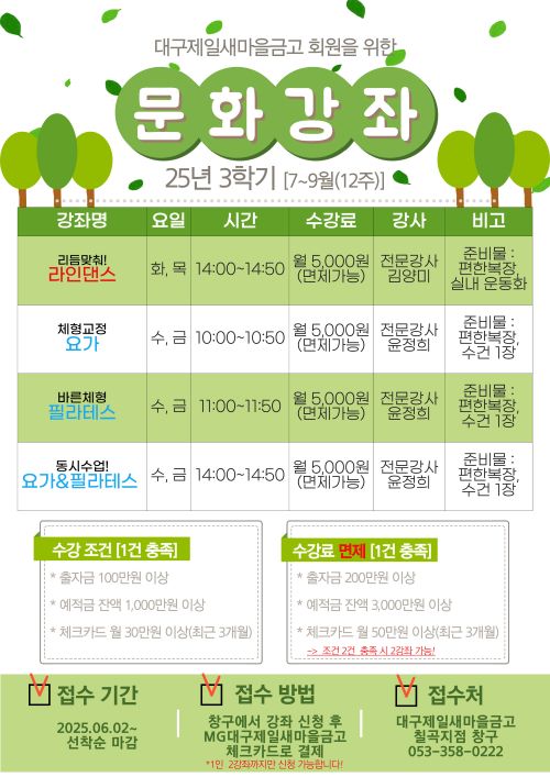 대구제일새마을금고 칠곡지점 25년 3학기 문화센터 회원모집