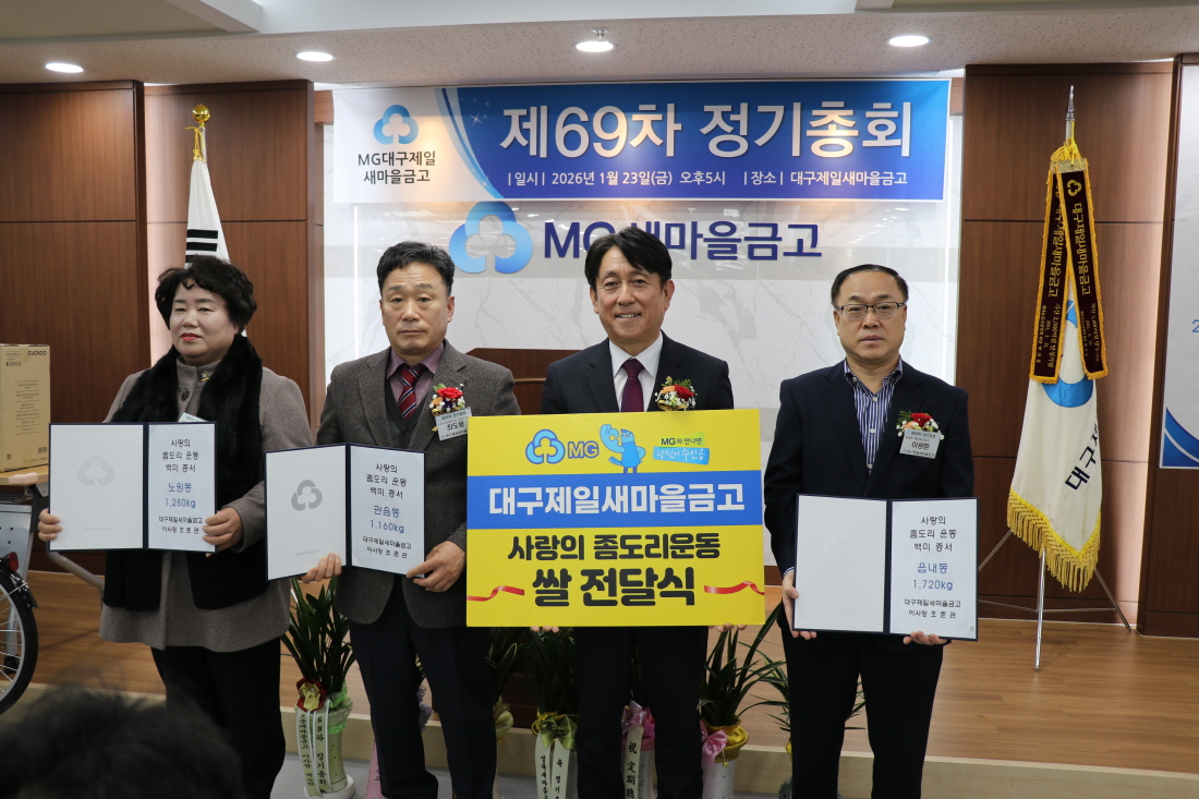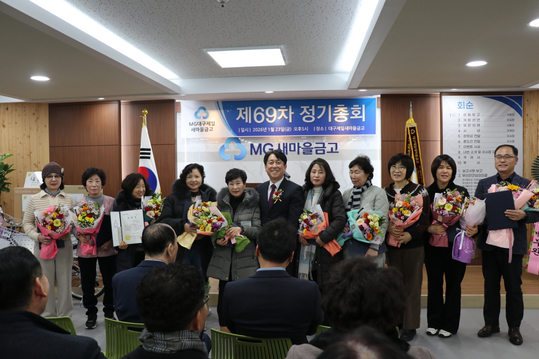 2026년 1월 23일 대구제일새마을금고 제69차 정기총회를 개회하였습니다. 먼저 중앙회장 표창, 본부장 표창 및 북구이사장협의회 표창 수여가 있었습니다.